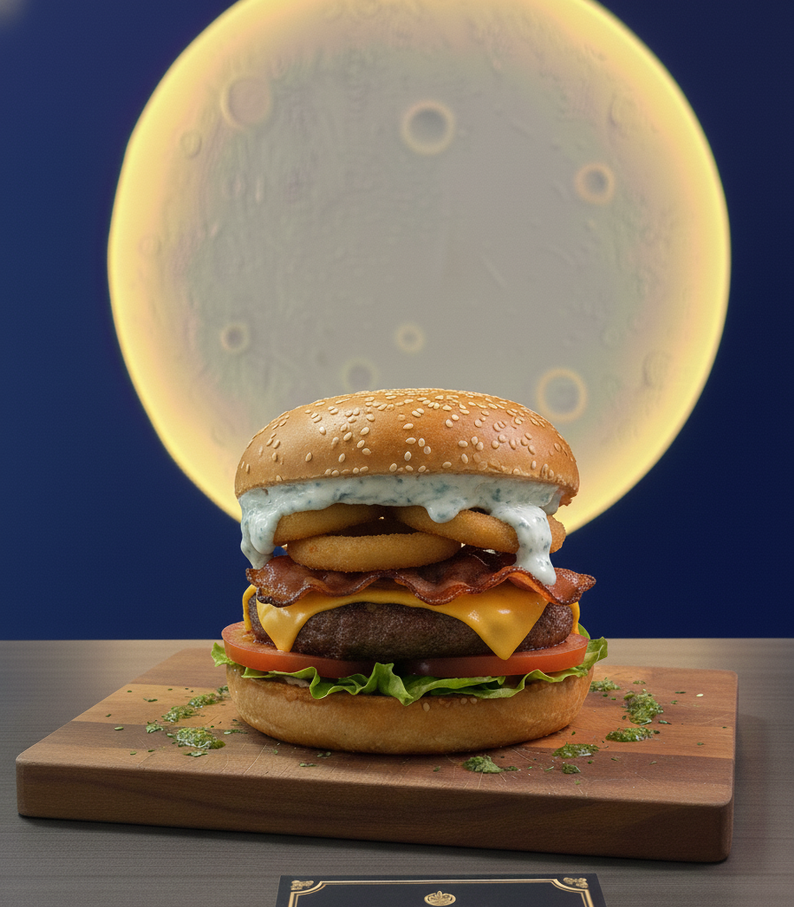 150 gramos de carne de res a la parrila, queso cheddar, tocineta caramelizada y aros de cebolla