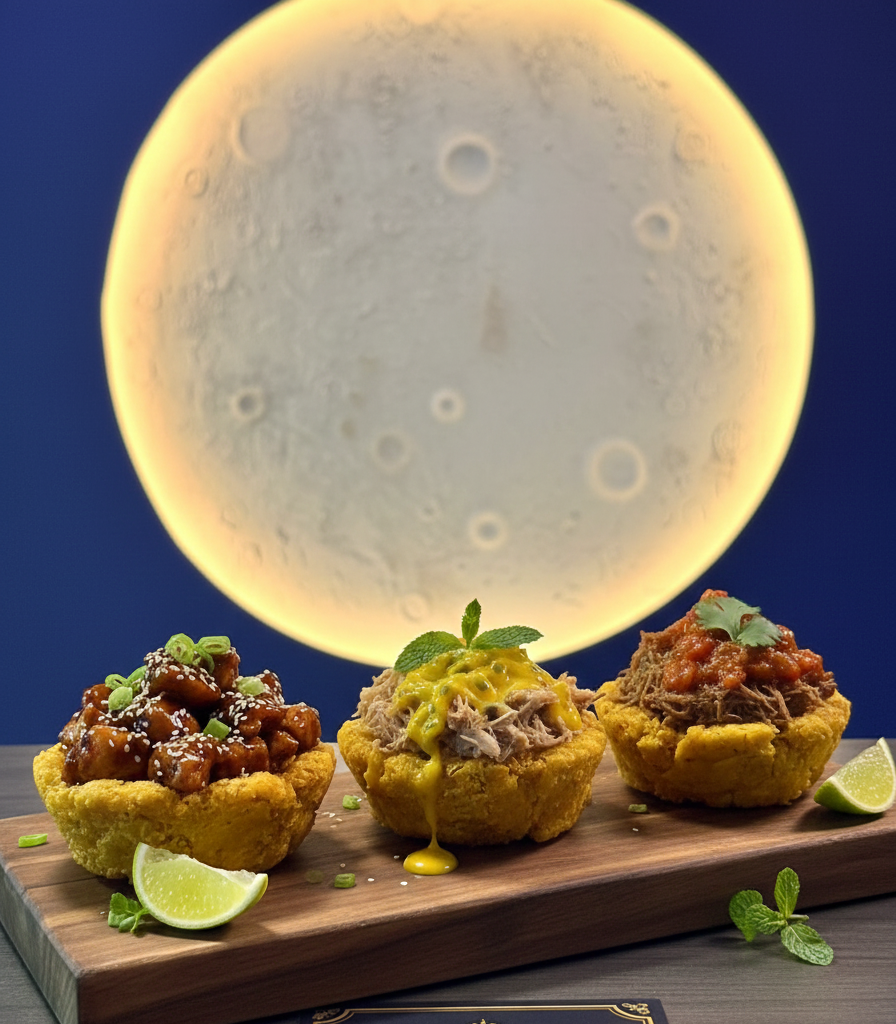 Canastas de patacones crocantes rellenas de pollo teriyaki, cerdo en salsa de maracuya y sobrebarriga en salsa criolla