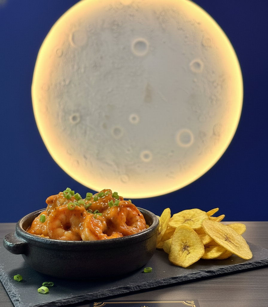 Camarones en salsa de pimientos asados acompañados de chips de plátanos