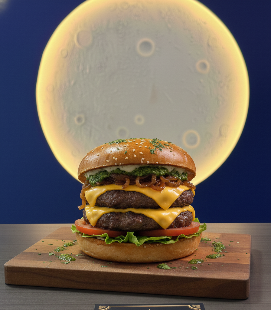 Doble carne de res a la parrilla queso cheddar, cebolla caramelizada,tomate,lechuga y pesto de cilantro