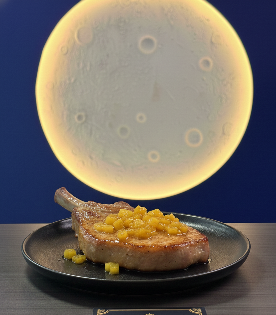 Chuleta de cerdo ( corte de carne con hueso 300g) bañado en salsa de piñas caramelizadas.